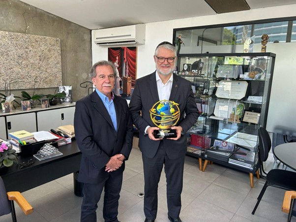 A Fundação Memória do Transporte (FuMTran) realizou, nesta sexta-feira (17), a entrega do troféu comemorativo de seus 30 anos ao presidente do Memorial da América Latina, Dr. Pedro Machado Mastrobuono. A homenagem, entregue pelo presidente da Fundação, Antonio Luiz Leite, pelo diretor da Instituição Jacsenis e pelo curador do projeto memória da Fumtran, Sérgio Kobayashi, reconhece a importância do Memorial para o país, e parceria institucional entre as entidades, que atuam de forma conjunta na valorização da cultura, da história e da memória brasileira.