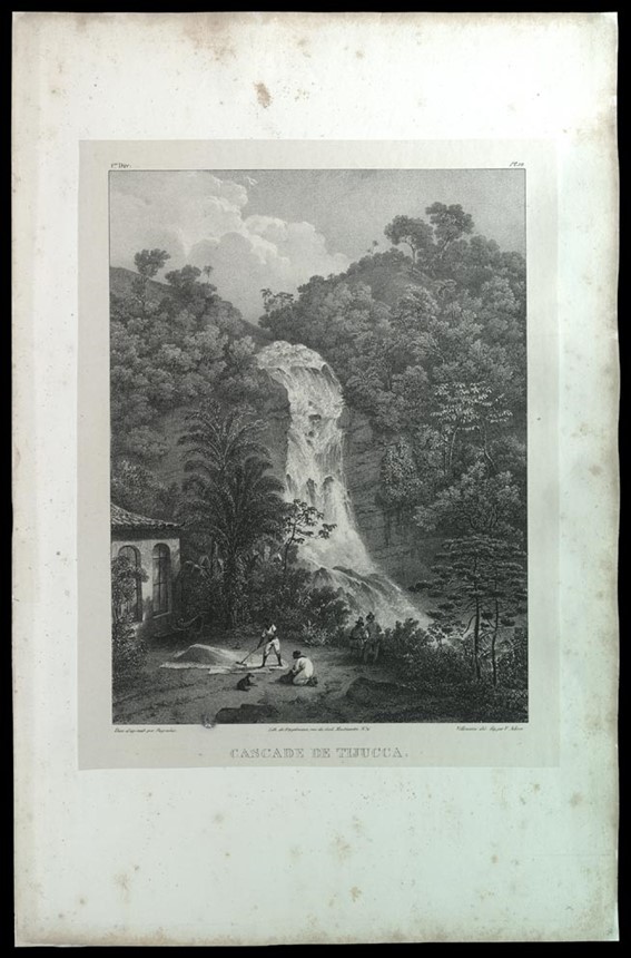 Cascade de Tijucca [Cascata e parte da floresta da Tijuca com casal de negros espalhando café em terreiro].