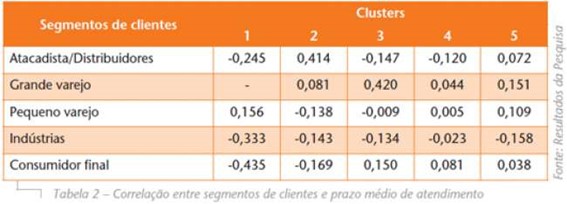 Na questão específica dos segmentos de clientes, foram testadas algumas hipóteses com relação a diferenciais de nível de serviço. Primeiramente, buscou-se identificar se o prazo de atendimento variava de acordo com o segmento do cliente. Como pode ser observado na Tabela 2, através dos coeficientes de correlação é possível verificar que todos os clusters apresentam correlação negativa entre percentual de venda para indústrias e tempo de atendimento. Este resultado aponta que os prazos de atendimento são menores para clientes de maior porte. Nesse sentido, a indústria exige melhor nível de serviço e é atendida nesse quesito pelos fornecedores.