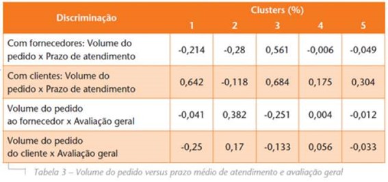 Buscou-se também verificar a correlação entre volumes financeiros negociados e prazo para atendimento do pedido dos clientes. A correlação entre as duas variáveis indica que existe uma relação inversamente proporcional entre o volume do pedido de compra de suprimentos e o prazo de atendimento por parte do fornecedor. Dessa forma, quanto maior o volume do pedido, menor o tempo de entrega. Ou seja, o nível de serviço aumenta quando estão sendo negociados maiores volumes financeiros. A exceção é o Cluster 3 (Varejo geral, cliente final e empresas industriais), no qual a relação é diretamente proporcional, ou seja, os prazos aumentam à medida que o volume do pedido se eleva (Tabela 3).