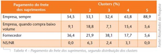 Foram investigadas as formas de relacionamento das empresas com fornecedores e clientes no mercado, via necessidades de transporte. As empresas geralmente usam o sistema de compras FOB (Tabela 4), isto é, responsabilizam-se pelo pagamento do frete para receber matérias-primas e demais materiais e componentes. Esta realidade é mais presente para empresas do Cluster 5 (atacadistas, grande varejo e indústrias nacionais).