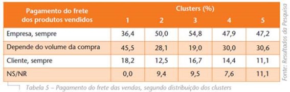 Assim como na compra de matérias-primas, as empresas estudadas são responsáveis por arcar com o transporte na maior parte dos casos (48,6%) na venda de seus produtos (Tabela 5). Apesar de esta característica ser comum a todos os clusters, pode ser notada mais fortemente nas empresas do Cluster 3, no qual 54,8% das empresas arcam com os custos de transporte, independentemente do volume comprado. Já no que diz respeito às empresas que condicionam a responsabilidade do transporte em função do volume da compra, estão mais presentes no Cluster 1 (empresas industriais e de distribuição em todo o território).