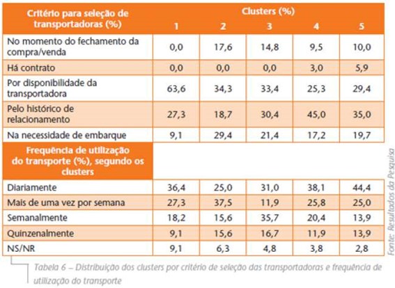 Além da responsabilidade pelo custo do transporte, buscou-se verificar também os critérios utilizados pelas empresas na contratação das transportadoras. A maior parte das empresas faz uso diário do serviço de transporte. Das empresas que optam por contratar as transportadoras quando da necessidade de embarque da carga, grande parte se concentra no Cluster 2 (varejo local). As empresas que utilizam como critério a disponibilidade das transportadoras estão fortemente presentes no Cluster 1 (empresas industriais e de distribuição em todo o território). Já as empresas que escolhem as transportadoras com base no histórico de relacionamento, podem ser encontradas em todos os agrupamentos, particularmente nos Clusters 4 (varejo de todo o território) e 5 (atacadistas, grande varejo e indústrias nacionais), que são aqueles também de maior frequência (Tabela 6).