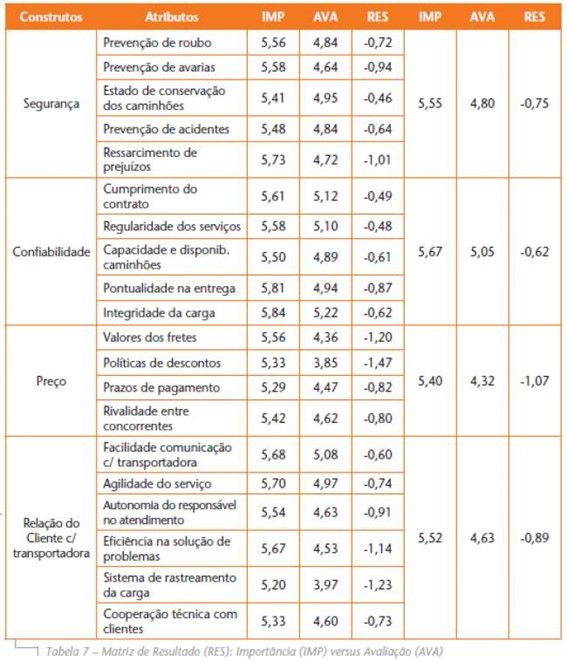 Conhecer o que o cliente valoriza é o primeiro passo para buscar a sua satisfação e se diferenciar da concorrência. Em uma prestação de serviço, como no caso de contratação de transporte, a satisfação do cliente pode ser medida pela diferença entre a importância que ele atribui ao serviço e a avaliação do mesmo. Isso é reforçado pelo fato de as empresas acompanharem mais de perto aqueles fatores que mais impactam no seu negócio. Desta forma, buscou-se nesta seção conhecer quais eram os atributos do transporte mais importantes para os embarcadores e, na sequência, qual era o desempenho das prestadoras de serviços logísticos nestes atributos. Os resultados, portanto, apontam para gaps (lacunas) entre o que o embarcador espera de um serviço logístico e o que lhe é entregue. Os resultados estão na Tabela 7, onde é possível verificar que os atributos relativos à Confiabilidade têm maior importância para as empresas estudadas, seguidos de perto por aqueles relativos à Segurança.